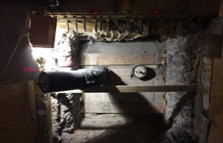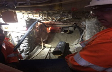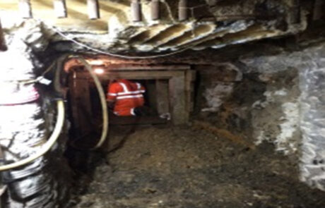 Once the sewer was reached two 300mm diameter cores were drilled in the sewer to form the connection points. Two 225mm Cast iron pipes were installed in the cores and made good with sand and cement. The heading was then piped and packed and the soffit grouted.