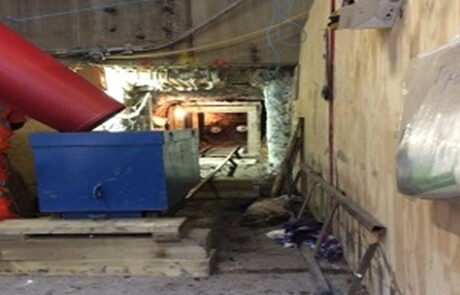 The heading had to pass through a box out in the internal wall of the basement which was formed by Laing O’Rourke. Behind the wall was a piled wall consisting of 750mm diameter reinforced concrete piles. The piled wall was removed by a specialist concrete cutting contracted using rotary core drilling and a robotic breaker (Brok 80).