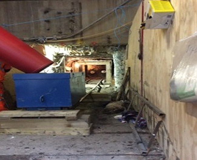 The heading had to pass through a box out in the internal wall of the basement which was formed by Laing O’Rourke. Behind the wall was a piled wall consisting of 750mm diameter reinforced concrete piles. The piled wall was removed by a specialist concrete cutting contracted using rotary core drilling and a robotic breaker (Brok 80).