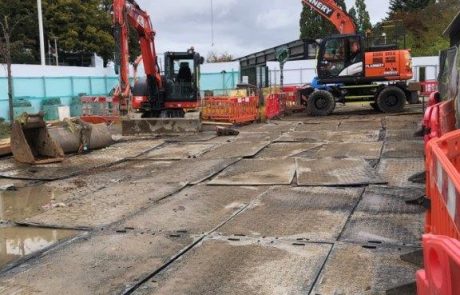 The works were located in the client’s car park which was in continuous use throughout the project. A temporary GRP hoarding system with digilock-controlled access gates was employed to segregate the works and provide robust security. This required temporary works and a specialist contractor, Westgate, to design and install the hoarding. Temporary track mats were also used to protect the existing car park surfacing.