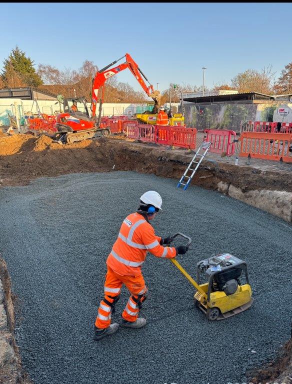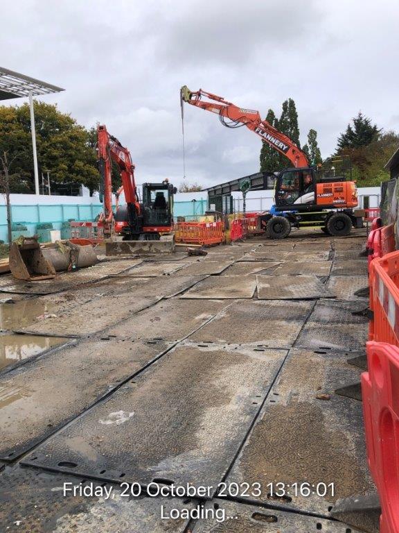 The works were located in the client’s car park which was in continuous use throughout the project. A temporary GRP hoarding system with digilock-controlled access gates was employed to segregate the works and provide robust security. This required temporary works and a specialist contractor, Westgate, to design and install the hoarding. Temporary track mats were also used to protect the existing car park surfacing.