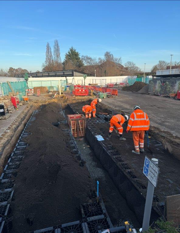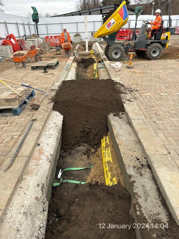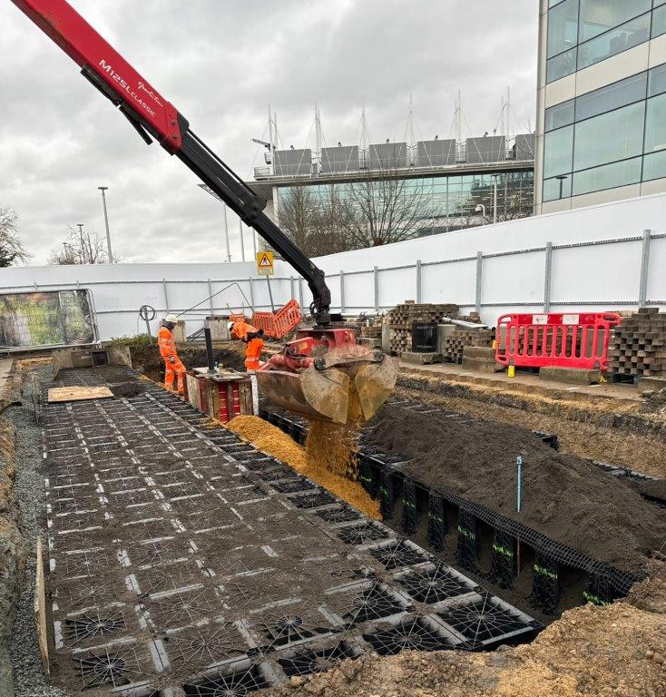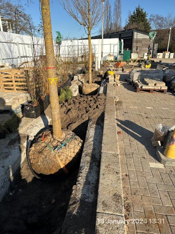 Additional works were instructed by the client to carry out tree pits works within the site hoarding. This involved the excavation and installation of tree a tree pit system to provide, irrigation drainage and root management to trees in the planting areas